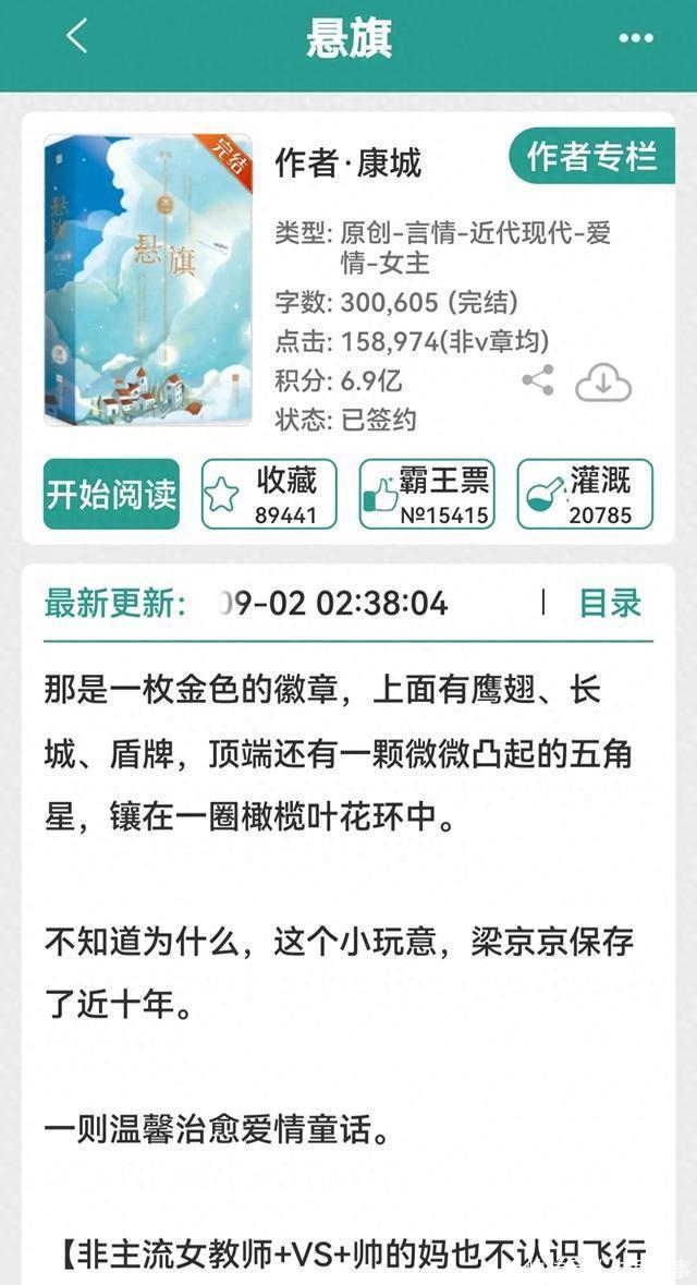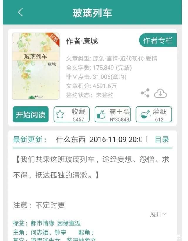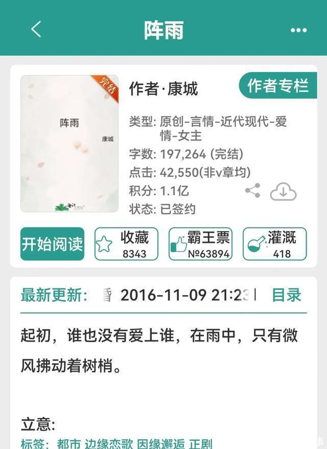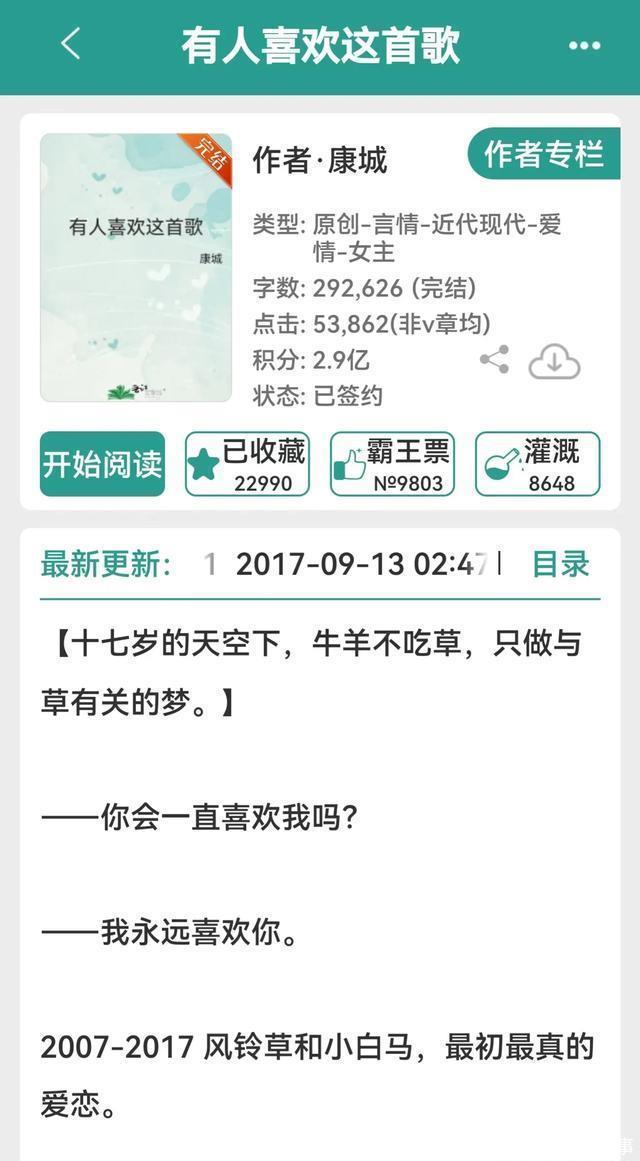 1:悬旗 14岁时骄傲美丽的大小姐梁京京遇上土气正直的谭真,10年后落魄的大小姐成为一位非主流英语老师重逢了帅气军官飞行员谭真,非常上头的爱情故事,我非常爱~ 2:有人喜欢这首歌 青梅竹马 2007-2017风铃草和小白马,最初最真的爱恋。 儿时因意外烫伤结缘的两人,高中重逢后展开双向暗恋,何滨从抵触到深陷,孙心妍则需平衡学业与懵懂情愫。…大学时女主为了男主去了哈尔滨读大学,不适应的环境气候却毅然决然的留了下来…而男主出国留学后的各种因素,女主选择分手…后来的后来当然是重逢啦…男主放不下女主重新追求… 初恋文里我最喜欢的一篇,作者把初恋的甜蜜和苦涩描绘的很细腻,不是单纯的甜,也有生活的苦,特别是番外里的he,让我觉得完满了 3:阵雨 一部现实向小说 讲述了一个清冷女记者与带着自闭症哥哥的总裁司机之间的故事。 独立清冷的女主陈岩和沉默寡言的糙汉男主,生活的苦让他们知道积极向上相互扶持的意义,细水长流的相处方式让人心里软的一塌糊涂,男主有责任感有信念感和担当,大爱 4:玻璃列车 两个孤独灵魂——钟亭与何志斌在创伤与救赎中相互吸引、彼此治愈…很心疼,康城大大总能细腻描绘出生活是苦的,但我们依然不会放弃生活! 5:浪潮 警校文 警校师兄陈翼和警校师妹万佳云因学校散打社结缘,男主为了保护女主退学,六年后的重逢,警校到警队,狼狗变身马子狗。 万星奔涌,浪潮悸动,是你的热血照耀我的信念。我更喜欢校园部分~